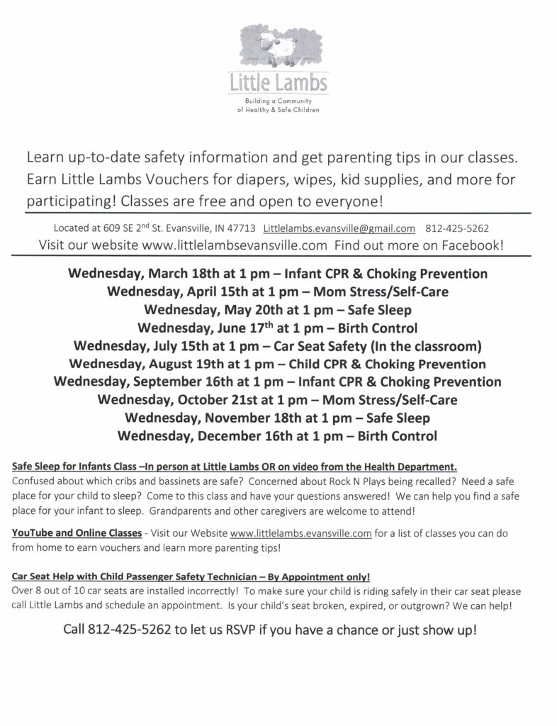 Earn Vouchers for attending classes in person or virtually! Use those vouchers to purchase diapers, wipes, kid clothes, car seats, and more. All Little Lambs Classes are FREE. Caregivers, friends, and grandparents are welcome to attend. Some classes require preregistration see details below or give us a call for more information!